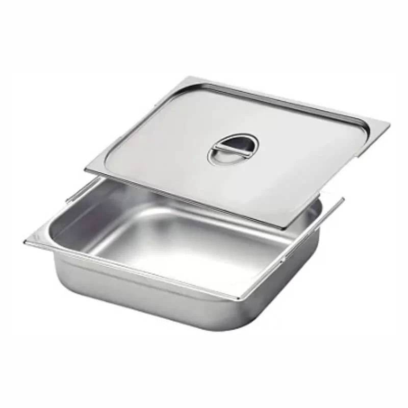 Cubas padrão GN 1/2 fabricada em aço inox aço inox com duas alças laterais e tampa, utilizada como cuba gastronômica de Inox em cozinhas profissionais no preparo e cocção de alimentos e como cuba GN para transportar refeições preparadas em caixas térmicas Hot Box.
