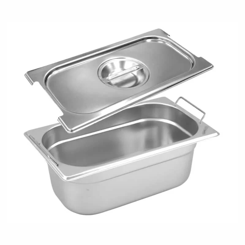 Cubas padrão GN 1/3 fabricada em aço inox aço inox com duas alças laterais e tampa, utilizada como cuba gastronômica de Inox em cozinhas profissionais no preparo e cocção de alimentos e como cuba GN para transportar refeições preparadas em caixas térmicas Hot Box.