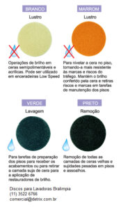 Para uso em enceradeiras e lavadoras Bralimpia nas tarefas de tratamento, lavagem e remoção de sujidades de pisos e para lustrar e polir assoalhos de hotéis, hospitais, lojas, escolas, restaurantes e indústrias com ou sem aplicação de agua e detergentes.
