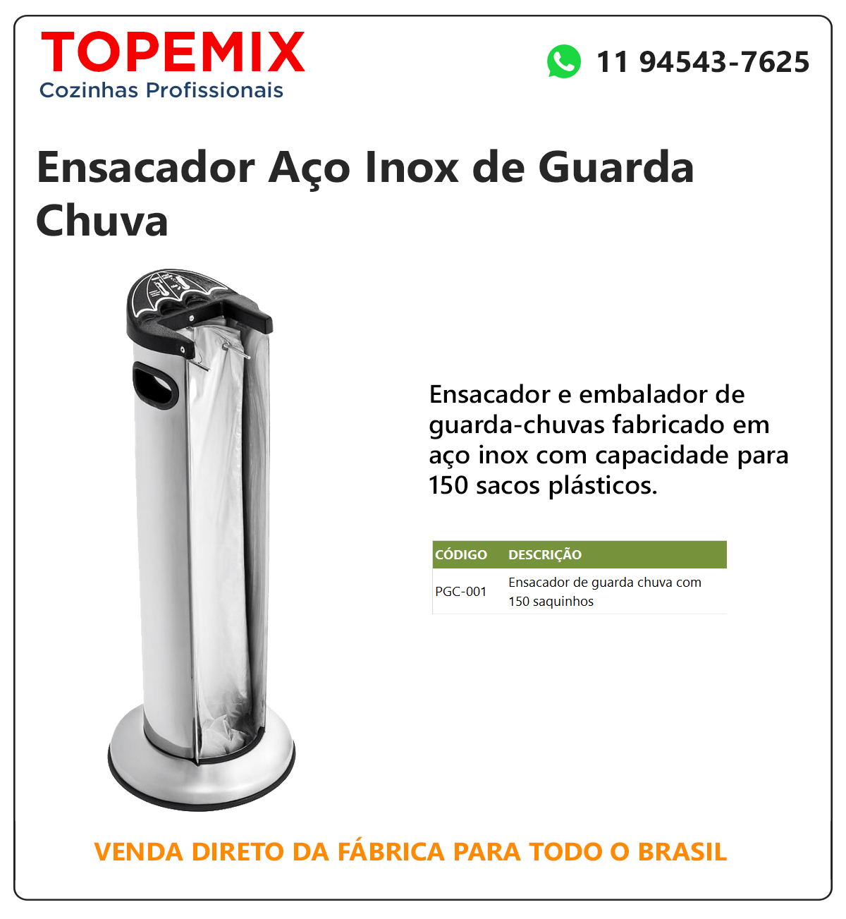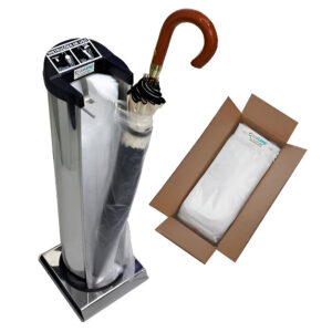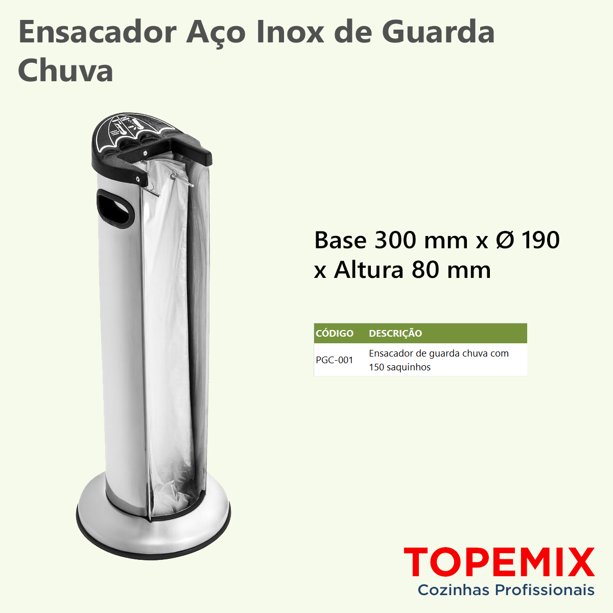 Utilizado como ensacador de guarda chuvas em recepções de escritórios, condomínios, padarias, hospitais, hotéis, restaurantes, shopping, lojas e indústrias para embalar guarda-chuvas molhados em sacos plásticos para ser transportados ou guardados em bolsas e armários evitando molhar ambientes.