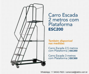 Escada para manutenção predial e reposição de gôndolas e estoques, fabricada em estrutura tubular reforçada com degraus e plataforma em chapa antiderrapante (chapa xadrez), guarda-copo na plataforma, corrimão em todo percurso atendendo às Normas de Segurança, cinto de segurança com fecho rápido e rodas fixas e giratórias.