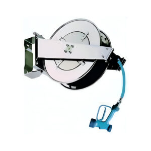 Esguicho com carretel e mangueira para cozinha profissional, fabricado com mangueira flexível resistente até 90°C, carretel enrolador em aço e ducha revolver antiderrapante.
