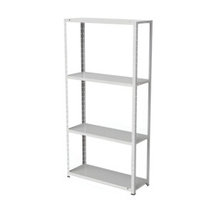 Estante de aço pintado para estoque seco de alimentos e bebidas e itens de limpeza, fabricada em aço carbono pintado em epóxi cinza com 4 prateleiras lisas.
