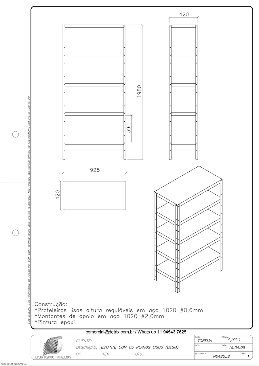 Estante Aço: C 925 x L 420 x A 1980 mm