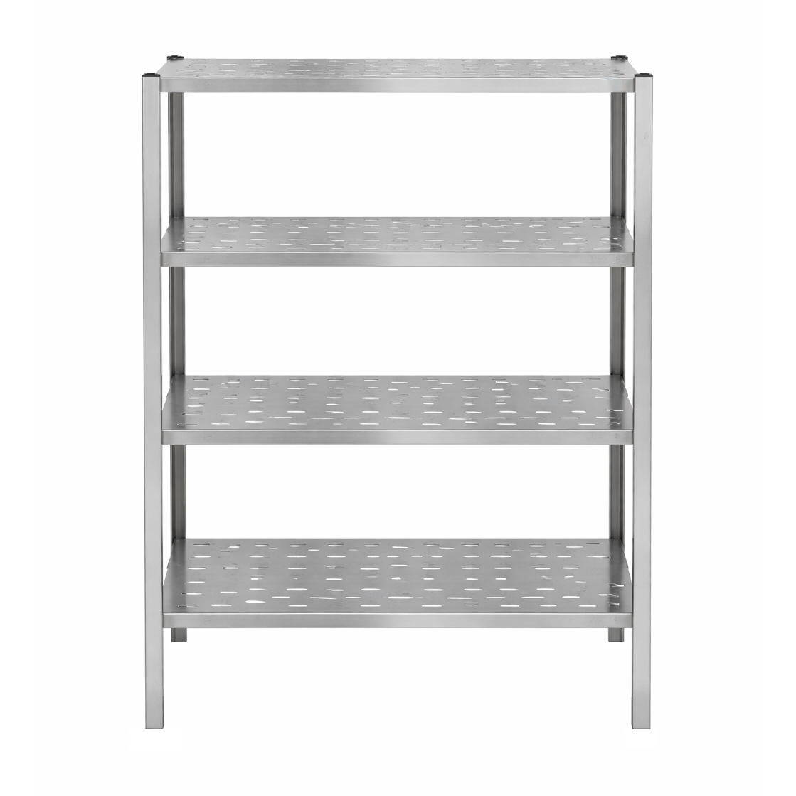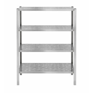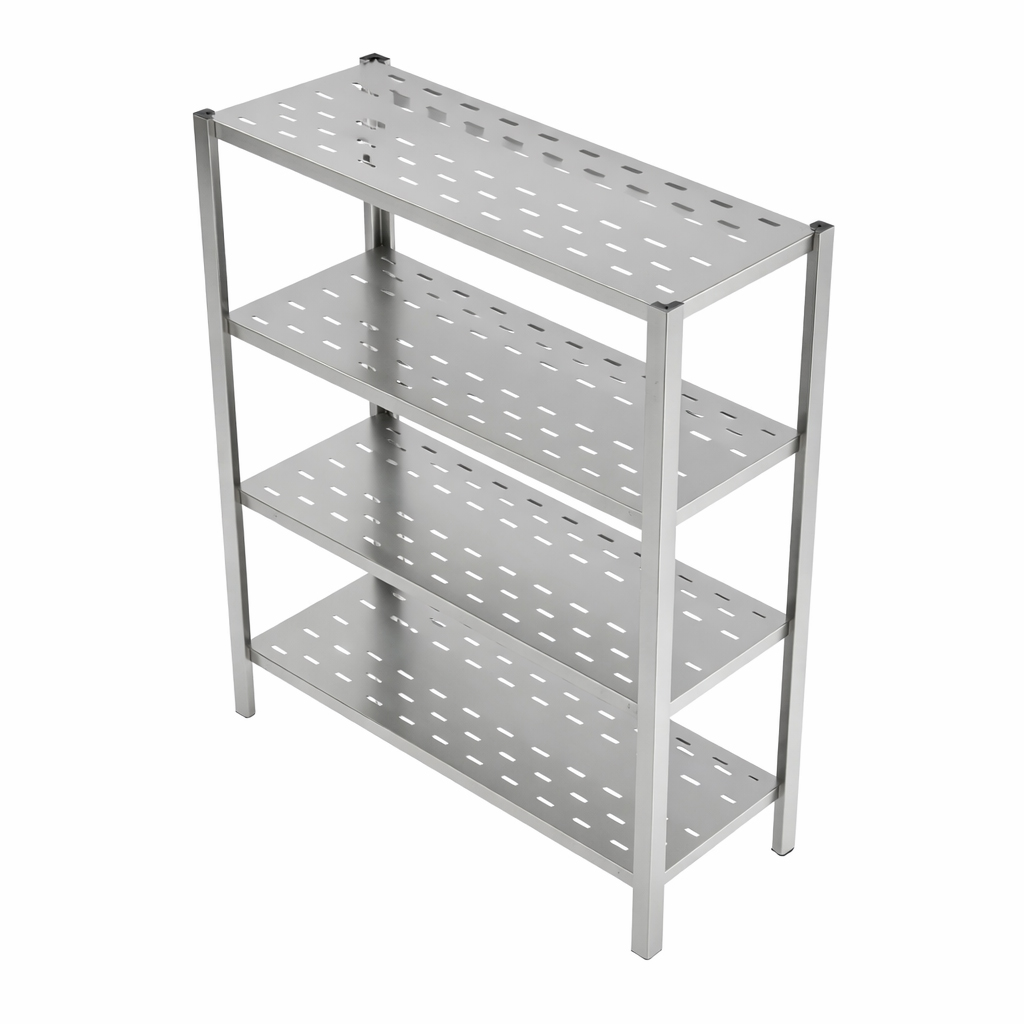 Estante de aço com 4 prateleiras perfuradas, fabricada em aço inox com laterais em cantoneiras reforçadas com regulagem de altura das prateleiras. Prateleiras com bordas de reforço. Capacidade de 180 Kg por prateleira.