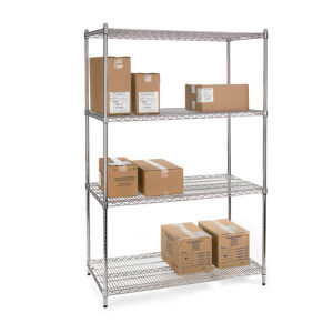 Estante aramada aluminizada de uso profissional para estoque e exposição de alimentos, bebidas e produtos em geral, fabricada em aço tubular com 4 prateleiras aramadas com acabamento aluminizado de alta resistência a corrosão.