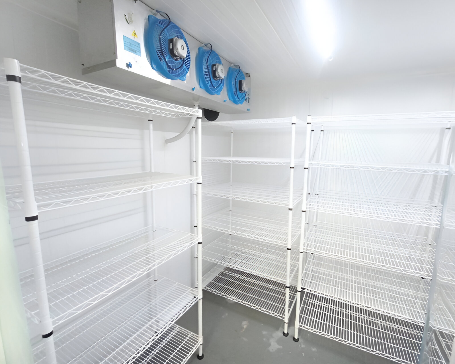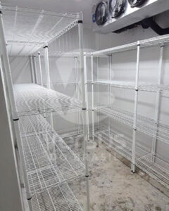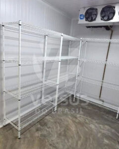 Estante aramada para câmaras frigorificas, fabricada em aço tubular com 4 prateleiras aramadas vazadas para circulação de ar e agua com acabamento em epóxi atóxico e antimicrobiano de alta resistência a corrosão e agentes químicos.