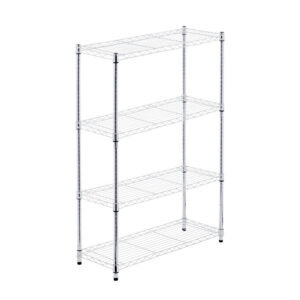 Estante aramada cromada de uso profissional para estoque e exposição de alimentos, bebidas e produtos em geral, fabricada em aço tubular com 4 prateleiras aramadas com acabamento cromado de alta resistência a corrosão.