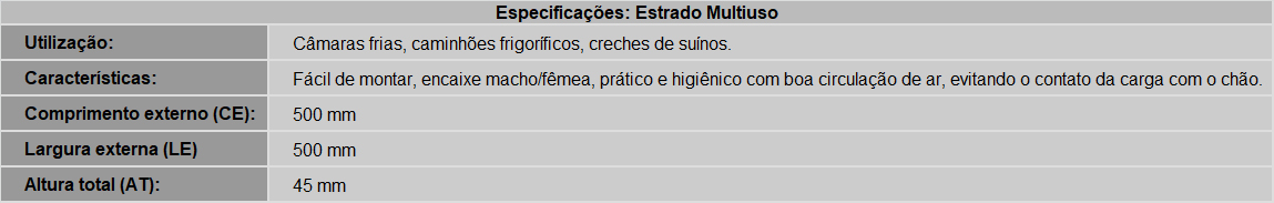Utilizado como Estrado plástico modular, Estrado plástico para câmera frigorifica, Estrado plástico vazado, Estrado plástico para pisos em áreas secas e molhadas de indústrias, centro distribuição, cozinha profissional, câmara frigorifica, restaurante, hospital, supermercado e armazenagem de produtos em geral