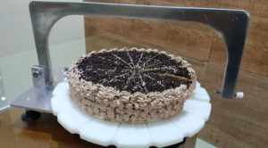 Fatiador de bolos de vitrine, desenvolvido para fatiar de maneira limpa e padronizada, garantindo cortes precisos e uniformes em bolos de vitrine.