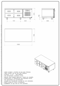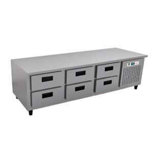 Freezer horizontal baixo, fabricado em aço inox com altura reduzida para acoplar chapa Vulcan, Char broiler, fogão de sobrepor e forno combinado.