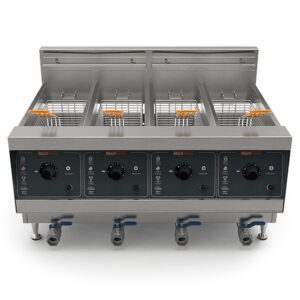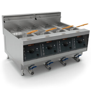 Fritadeira elétrica profissional SE-B4 fabricada em aço inox com 4 cestos de fritura e 4 cubas para 32 Litros de óleo com cubas para zona fria de óleo profundas, aumenta a durabilidade do óleo e economia dos insumos; Resistência elétrica de 20.000 W em aço inox; Controle de temperatura eletromecânico independente; Luz indicativa de funcionamento e chave liga/desliga no painel frontal; Sistema de segurança contra superaquecimento do óleo; Válvula frontal para drenagem e higienização.