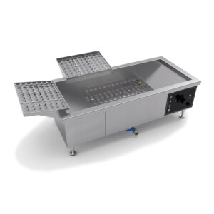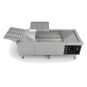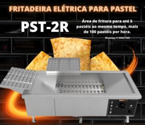 Fritadeira de pastel elétrica, fabricada em aço inox com controle de temperatura digital, zona fria que retem os detritos que se soltam dos pasteis, resistências submersas blindadas em inox e escorredor móvel do pastel frito; Garantia de 2 anos de fábrica para estrutura e vazamentos.