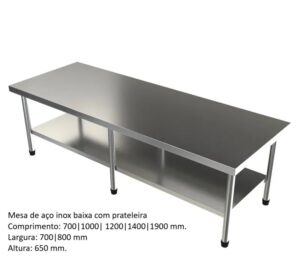 Operacional: Mesa de aço inox baixa com prateleira inferior, para apoio de fritadeira, fogão, chapa e estufa de batatas.