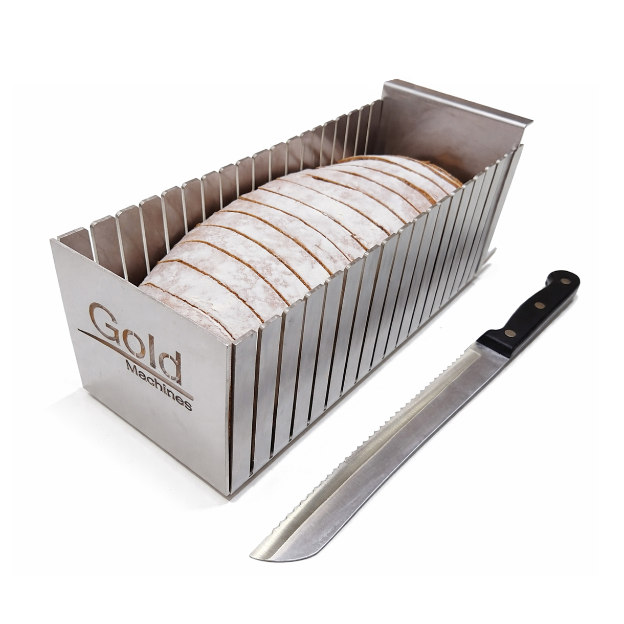 Gabarito de corte para fatiar pães, desenvolvido para padronizar e agilizar o corte de pães em fatias simétricas e perfeitas.