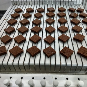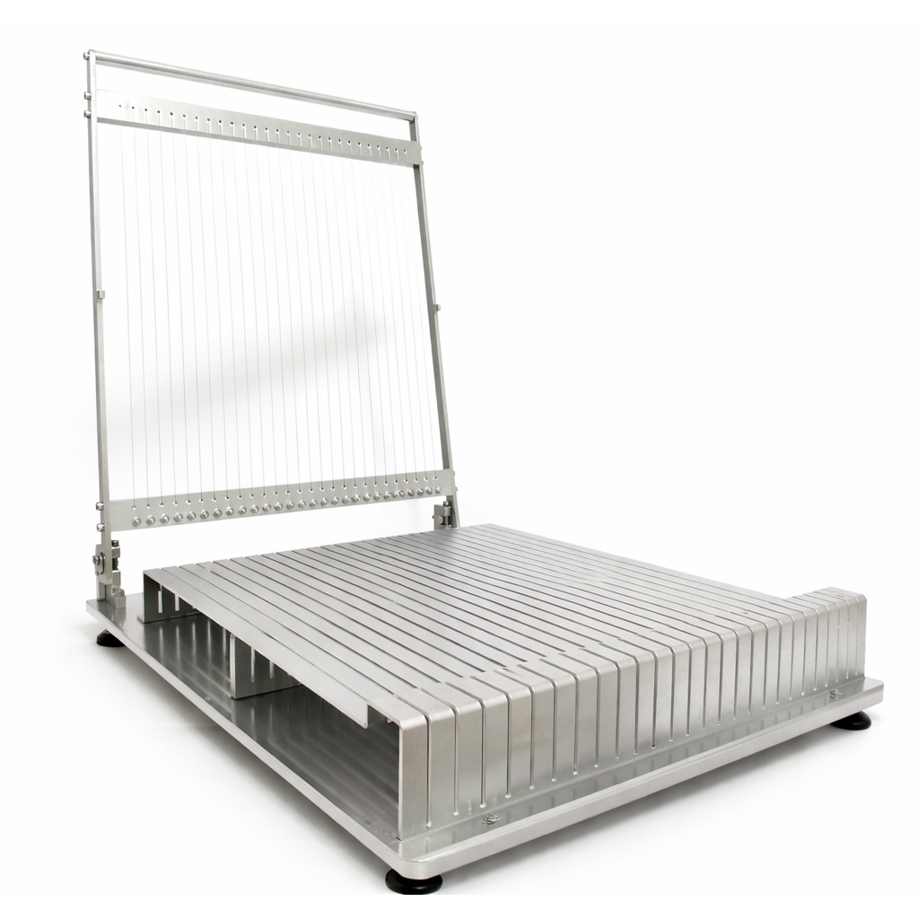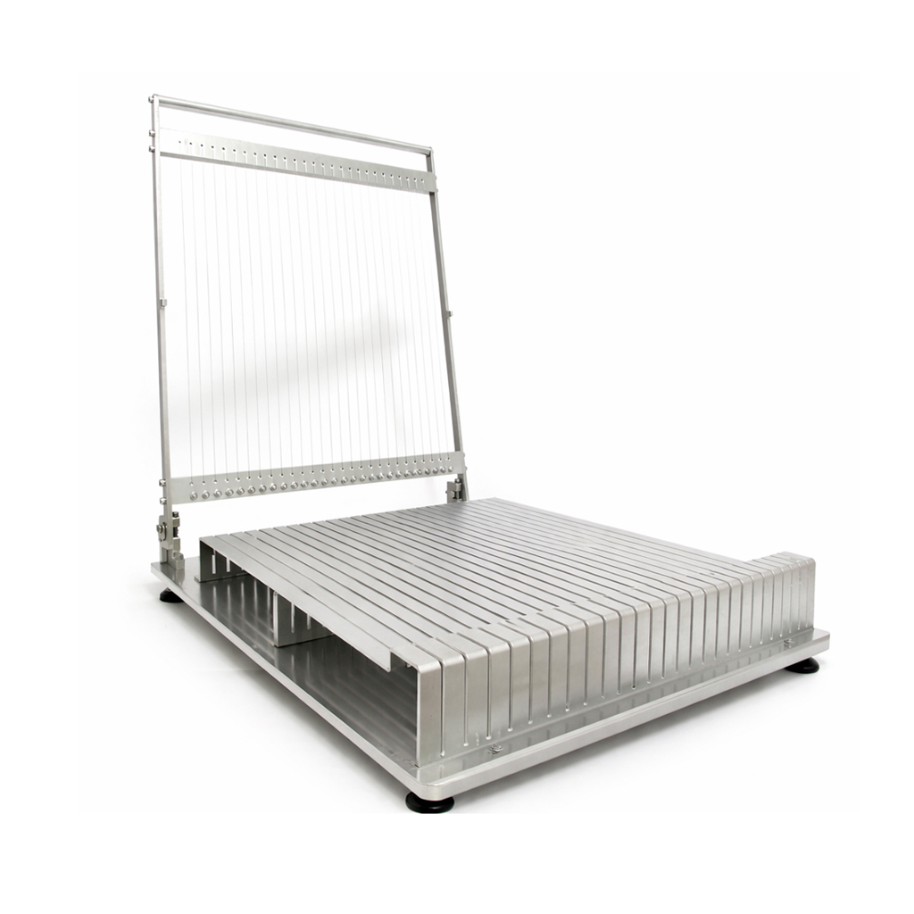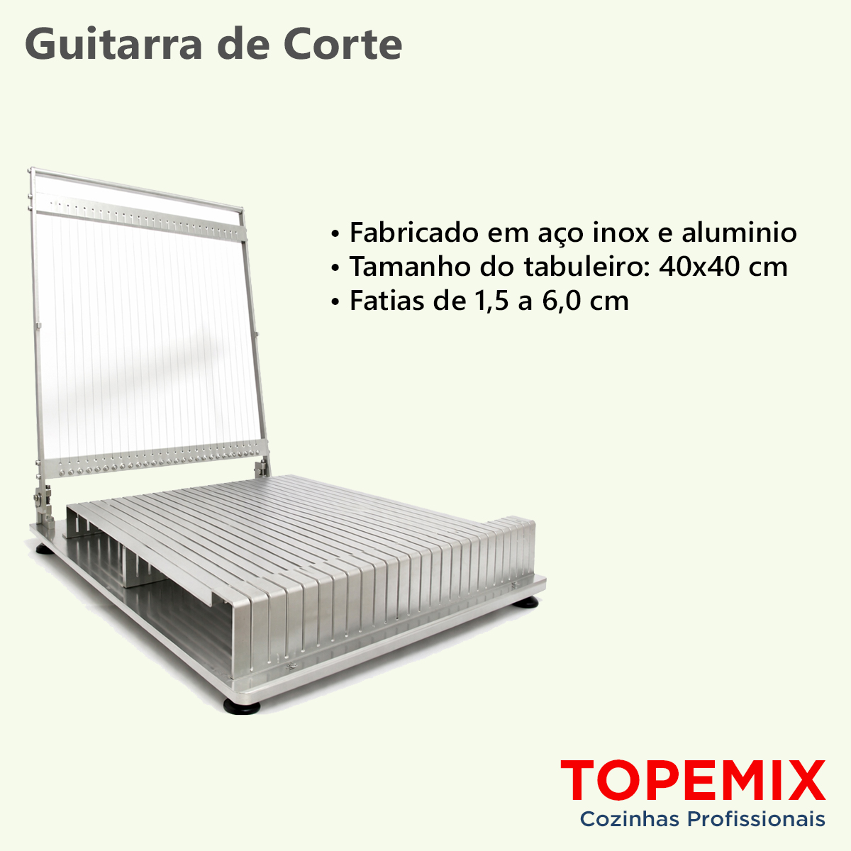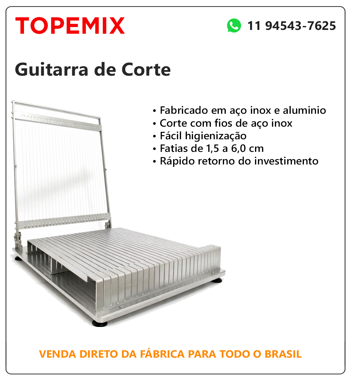 Guitarra de corte, desenvolvida para agilizar e padronizar a produção e o corte de doces e salgados que requerem uniformidade e rapidez. Equipado com fios de aço inoxidável de padrão alimentício, o a guitarra de corte realiza cortes limpos e precisos, preservando a estrutura, as camadas e o acabamento do alimento.