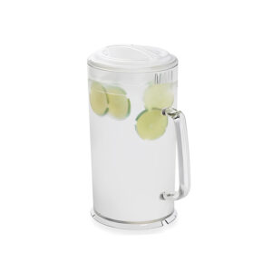 Jarra de policarbonato camwear Cambro com tampa, fabricada em policarbonato fosco com tampa de 3 posições para evitar a passagem do gelo, servir sem impedimento e fechar a jarra para proteger o conteúdo.