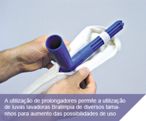 Jogo de prolongadores Bralimpia, produzido em polipropileno para utilização de luvas acrílicas com larguras deferentes, definidas em função do local e da área de trabalho.
