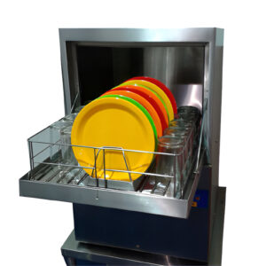 Modelo de bancada com abertura frontal, fabricada em inox com isolamento térmico. Temperatura de lavagem 50º a 60ºC e de enxágue 80º a 90ºC. Consumo de água 2 Litros por ciclo e de energia 3 Kw. Ciclos de 60 e 120 segundos.