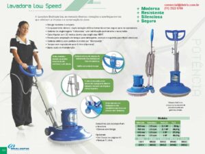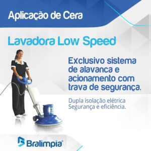 Lavadora e enceradeira Bralimpia, utilizada nas tarefas de lavagem e polimento de pisos, preparação para impermeabilização de pisos e na aplicação de ceras em assoalhos de hotéis, hospitais, indústrias, lojas, escolas, cozinha, condomínios e restaurantes utilizando escovas de cerdas e discos abrasivos.
