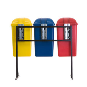 Conjunto de lixeiras papeleiras para coleta seletiva, fabricado em polietileno com aditivo anti-UV contra variações climáticas (sol, chuva e poluição), trava para saco de lixo, tampa com chave e estrutura em tubo de aço carbono com pintura eletrostática.
