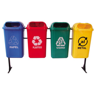 Utilizado como conjunto de coleta seletiva e kit de coleta seletiva com base para fixar em pisos e calçadas de condomínios, praças, shoppings, indústrias, hotéis, hospitais e pontos de coleta.