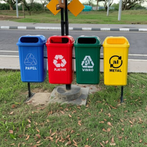 Conjunto de lixeiras papeleiras para coleta seletiva, fabricado em polietileno com aditivo anti-UV contra variações climáticas (sol, chuva e poluição), trava para saco de lixo, tampa com chave e estrutura em tubo de aço carbono com pintura eletrostática.