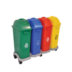Conjunto de lixeiras para coleta seletiva Bralimpia com tampa vai e vem, fabricado em polietileno alta densidade com aditivo anti-UV contra variações climáticas (sol, chuva e poluição), alças laterais e base com rodízios.