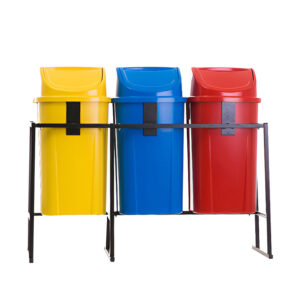 Conjunto de lixeiras com tampa basculante para coleta seletiva, fabricado em polietileno com aditivo anti-UV contra variações climáticas (sol, chuva e poluição), trava para saco de lixo e tampa basculante em estrutura em tubo de aço carbono com pintura eletrostática.