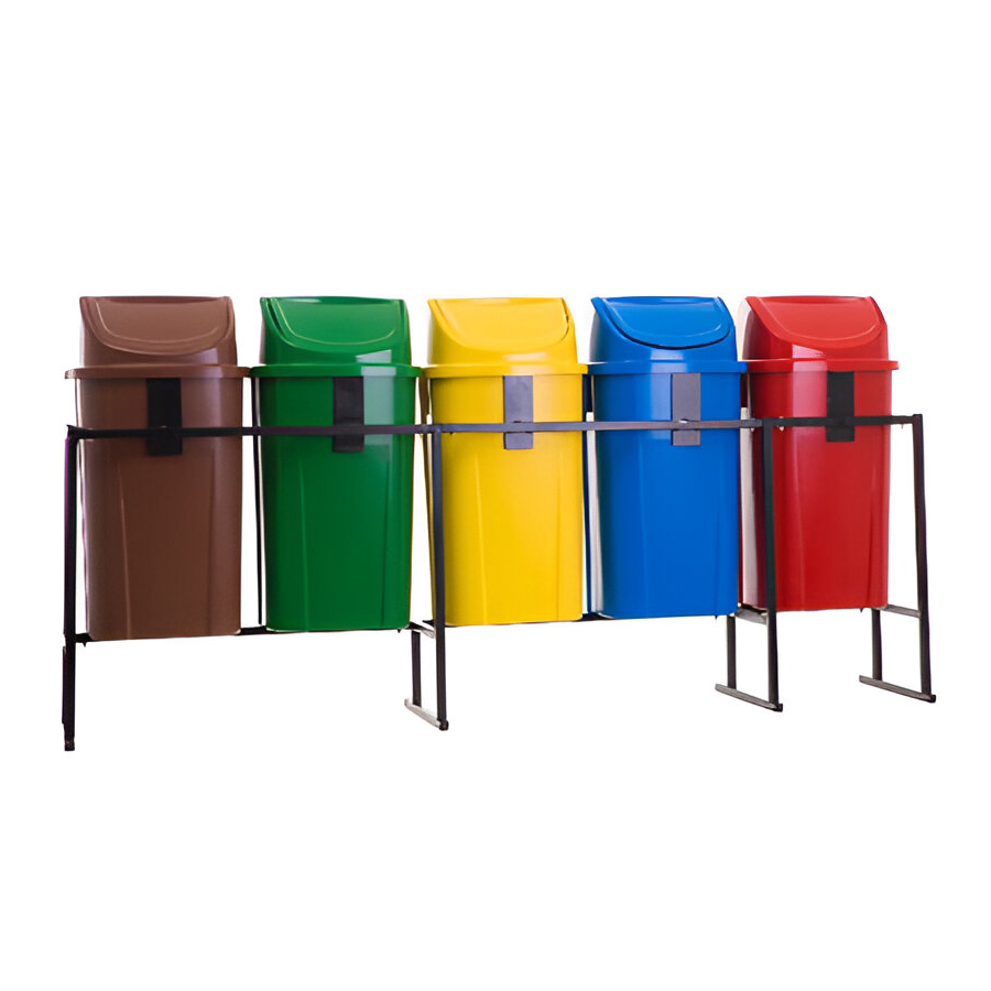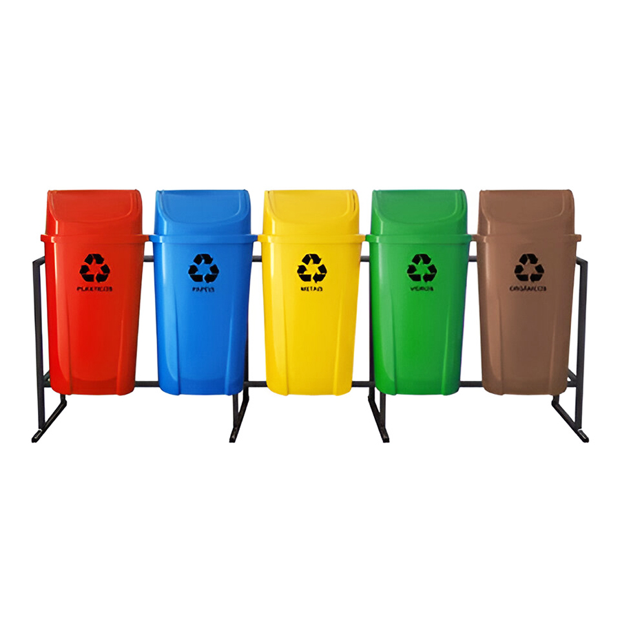 Utilizado como conjunto de coleta seletiva e kit de coleta seletiva com base para fixar em pisos e calçadas de condomínios, praças, shoppings, indústrias, hotéis, hospitais e pontos de coleta.