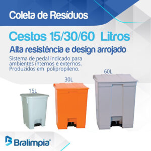 Lixeira plástica com pedal Bralimpia, fabricada em polipropileno com aditivo anti-UV contra variações climáticas (sol, chuva e poluição), tampa acionada por pedal com vedação contra dispersão de odores e aro para travar a boca do saco de lixo.