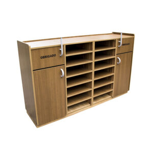 Lixeira fast food dupla com porta basculante vai e vem para praça de alimentação, fabricada em MDF com duas lixeiras laterais e dois porta badejas centrais revestidos em formica nas cores branco, cinza, marfim e amadeirado com puxador tubular colorido e compartimento para cesto de 100 Litros incluído.