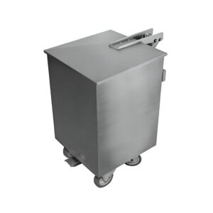 Lixeira de aço inox para cozinha profissional, utilizado carro porta detritos para transporte seguro de descartes e resíduos da produção de uma cozinha profissional, fabricado em aço inox no formato quadrado com tampa basculante, sistema de acionamento por pedal, alças anatômicas laterais para fácil transporte e rodízios giratórios Ø 3”, sendo dois rodízios simples e dois com freios.