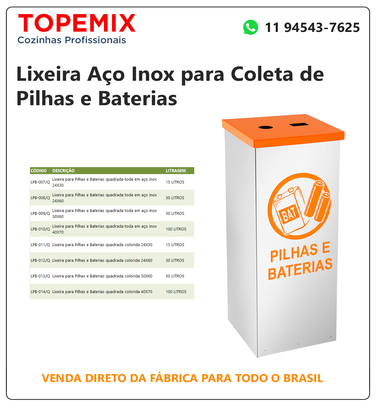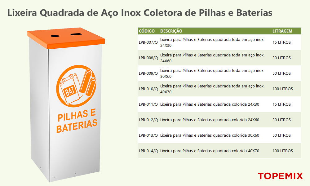 Lixeira Quadrada Aço Inox Coletora de Pilhas e Baterias – topemix.com.br