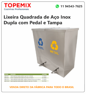 Utilizada como lixeira de aço inox dupla com pedal de acionamento da tampa para coleta seletiva de lixos e resíduos em restaurantes, cozinhas profissionais, praça de alimentação, refeitórios, hospitais, shopping, lojas, hotéis, condomínios e indústrias.