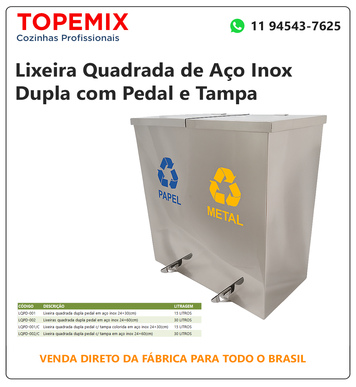 | LQPD001/C | Lixeira quadrada dupla Inox com pedal 24×30 cm (tampa colorida). | 15 Litros |