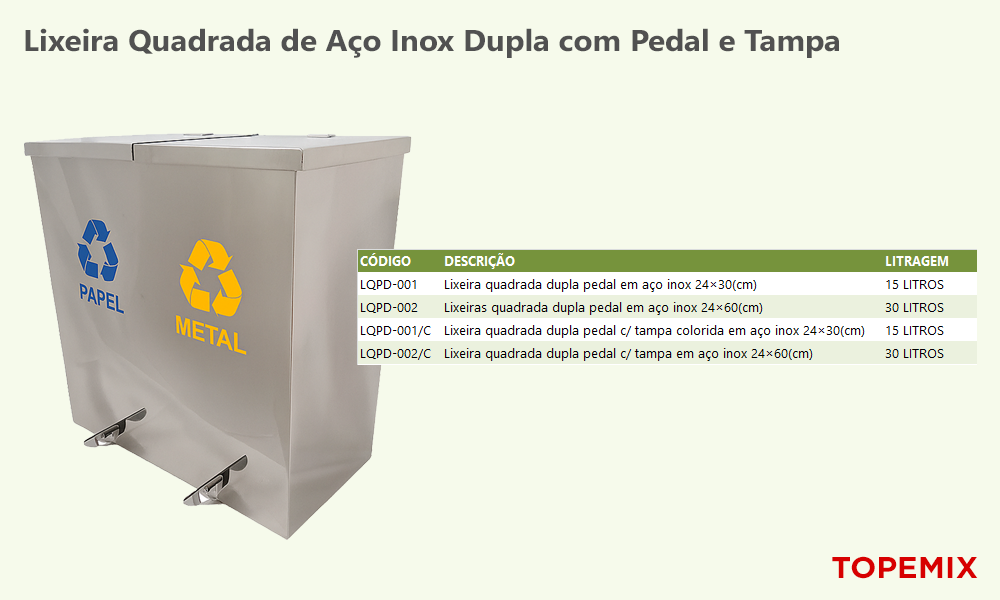 | LQPD001 | Lixeira quadrada dupla Inox com pedal 24×30 cm | 15 Litros |