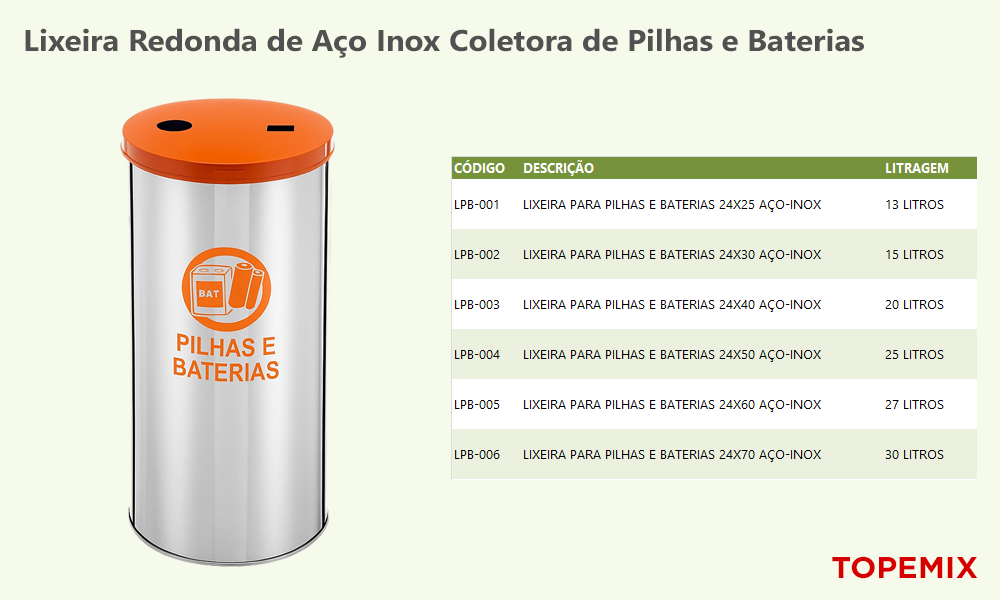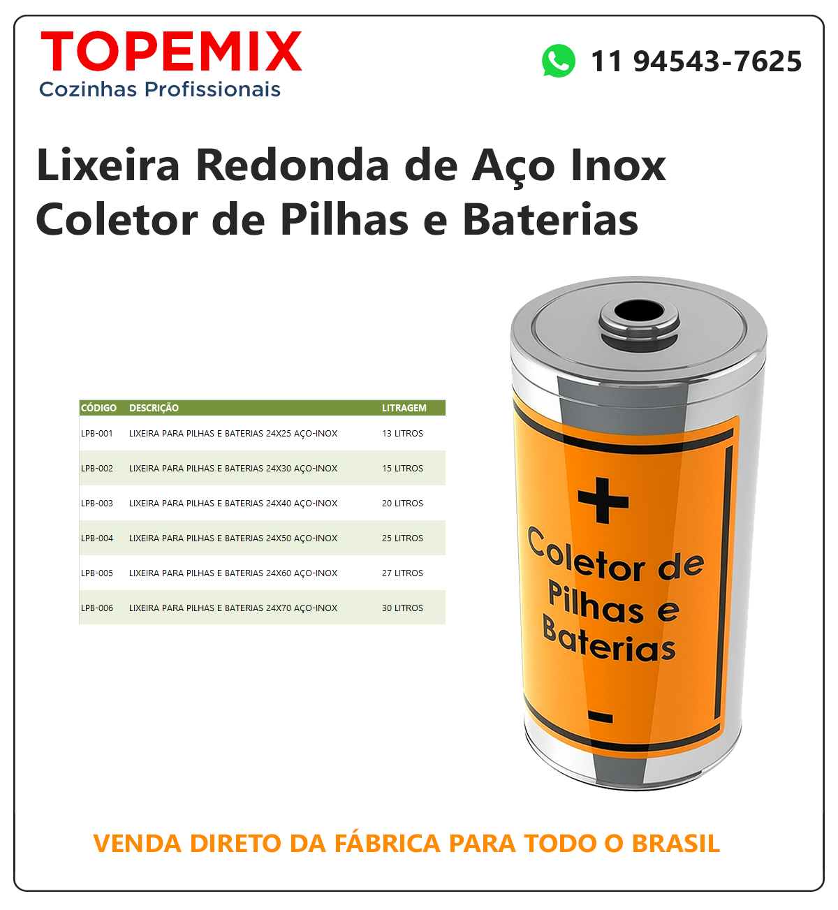 | LPB-001 | Lixeira para Coleta Pilhas e Baterias 24×25 | 13 Litros |