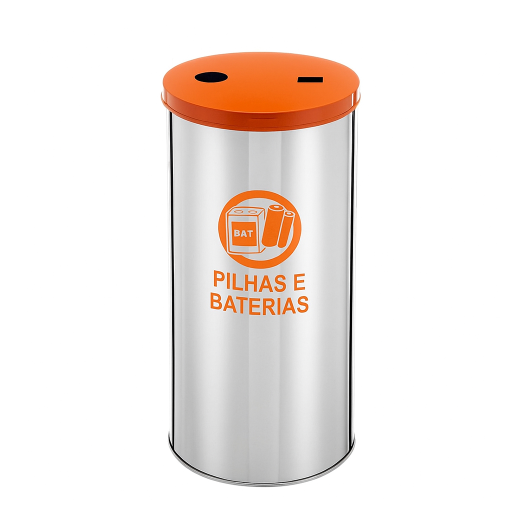 Lixeira redonda em aço inox para coleta de pilhas e baterias, com gravação na cor laranja conforme o padrão da coleta seletiva para pilharas e baterias. Fabricada 100% em aço inox, modelos com 1 ou 2 furações na tampa, oferecendo um design moderno que valoriza o ambiente, além de garantir segurança, alta durabilidade e fácil higienização.