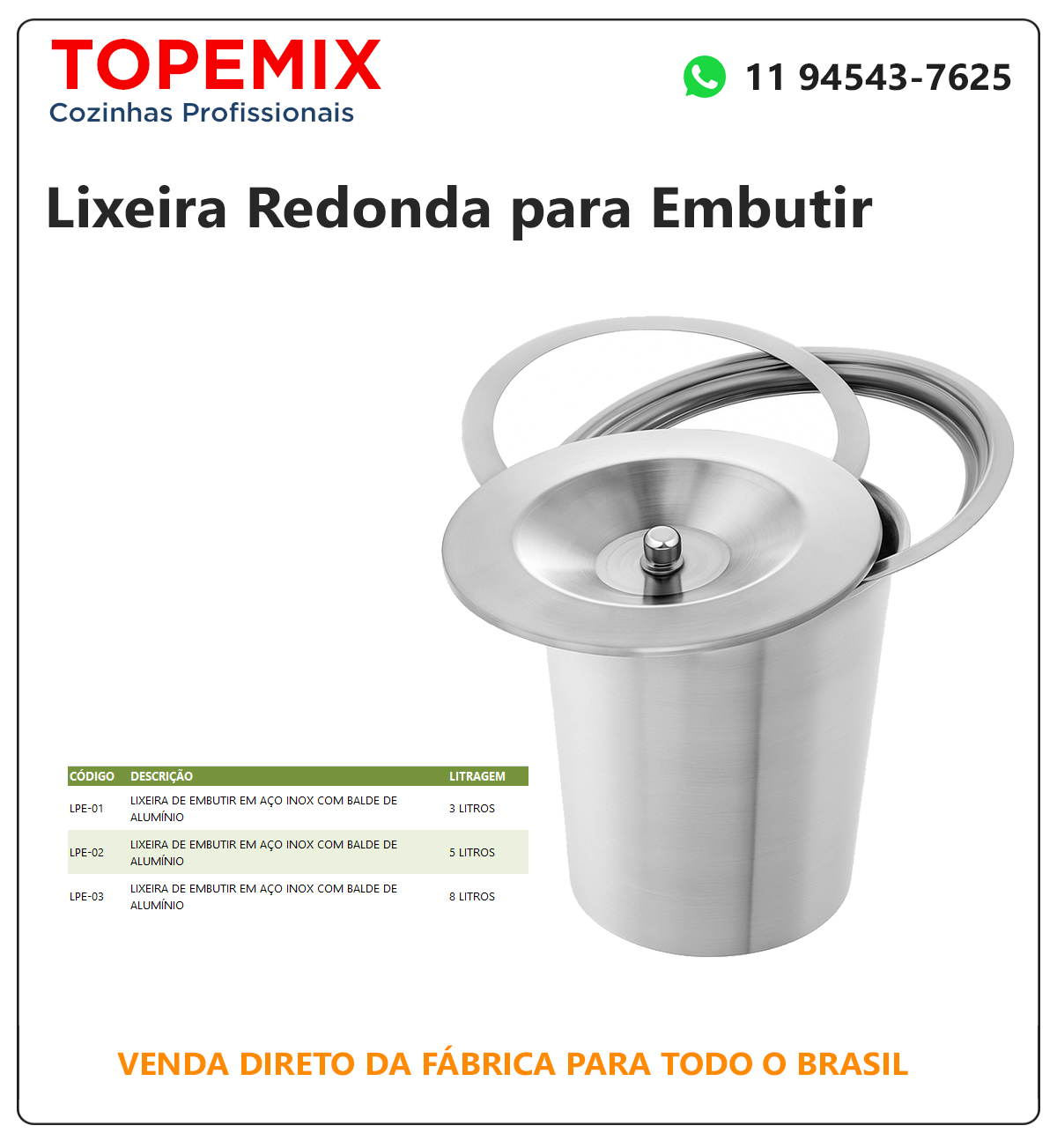 Lixeira redonda de Inox para embutir, fabricada em aço inox com balde de alumínio.