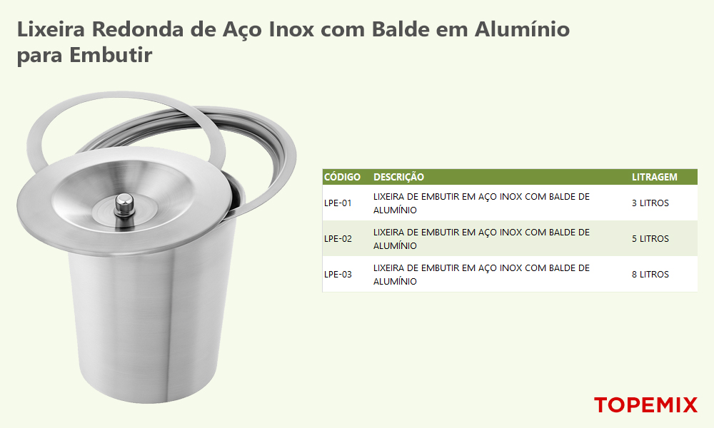 Tampa com puxador rente ao plano da pia. Balde de alumínio removível para descartes gerados no preparo de alimentos.