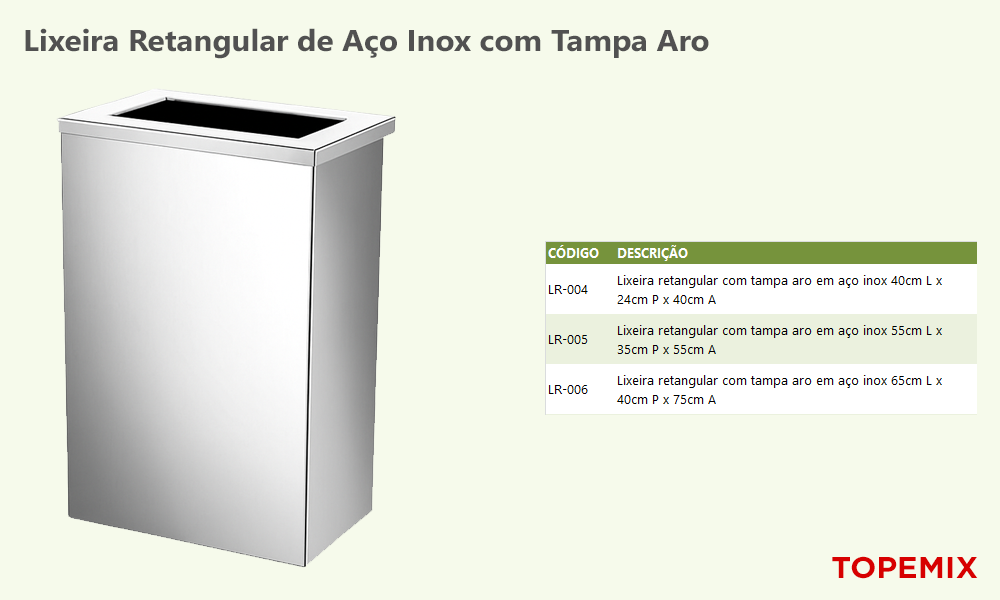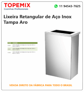 Utilizada como lixeira de inox retangular com tampa aro em lojas, hotéis, cozinhas, restaurantes, hospitais, shopping, condomínios e indústrias.