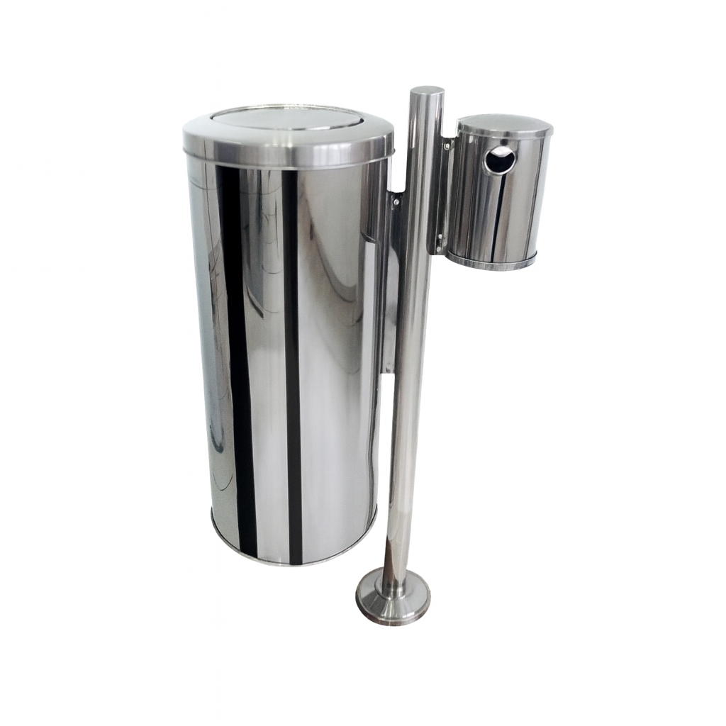 Lixeira urbana de aço inox com tampa basculante, pedestal e bituqueira para descarte de cigarros.