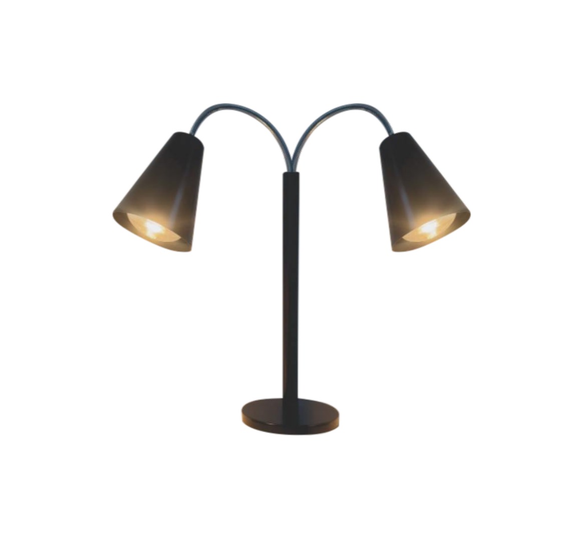 Luminária aquecedora de alimentos dupla, desenvolvida para manter a temperatura dos alimentos dando destaque e valorizando sua aparência por meio da lâmpada infravermelha.