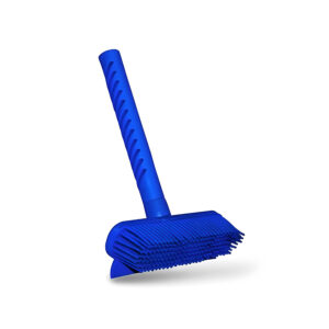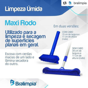 Maxi rodo Bralimpia com dois lados, produzido em polipropileno, sendo um lado com uma espessa escova com cerdas macias para varrição e limpeza de sujidades e do outro lado com uma lâmina que retira líquidos na secagem de superfícies planas em geral como vidros, alumínio, aço inox, paredes azulejadas, coifas, pisos frios em geral, mobiliários e carpetes.