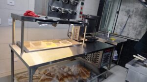 Mesa de montar hambúrguer e lanches refrigerada, fabricada em aço inox com condimentadora refrigerada para 6 cubas GN1/3×100 mm, pista quente de montagem e locais para tostador de pão, manteigueira, pump cheddar, micro-ondas, pegadores, bisnagas Fifo, prateleira para estufa de hamburger, nichos para papel de embrulhar hamburguer, pontos com 3 tomadas elétrica, prateleira para sacolas de delivery e embalagens cartonadas.