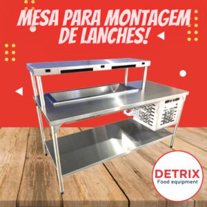 Utilizada e homologada como mesa refrigerada de montar lanches, mesa de montar hamburguer e mesa condimentadora de lanches refrigerada em redes de lojas de fast food e hamburgueria, para dinamizar operação e padronizar a montagem de hambúrguer e lanches.