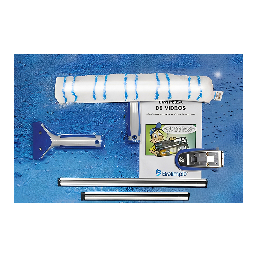 Kit Mini limpa vidros Bralimpia, contém os acessórios para as tarefas de limpeza em vidros em janelas, espelhos, pequenas áreas envidraçadas e nas rotinas leves de limpeza em hospitais, hotéis, escritórios, condomínios, indústrias, vitrines de lojas e residências.