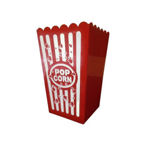 Utilizada como balde de pipoca e com pipoqueira de plástico em cinemas, home theater, festas juninas e eventos.
