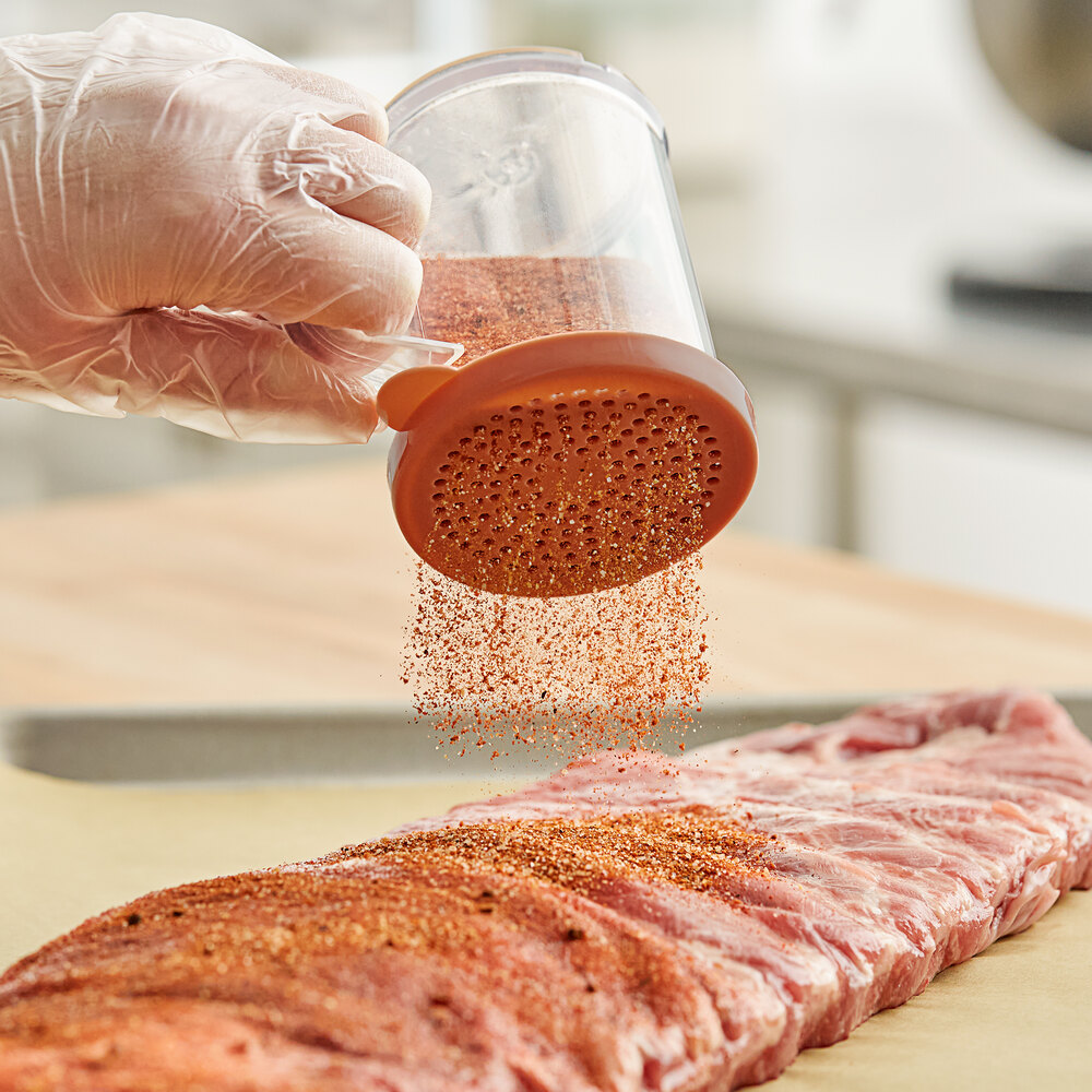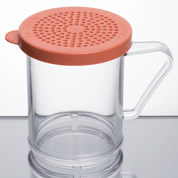 O polvilhador Cambro tampa rosa é utilizado como dispenser e como polvilhador de condimentos de moagem média em restaurantes, pizzarias, padarias, lojas do Subway e outros fast food.